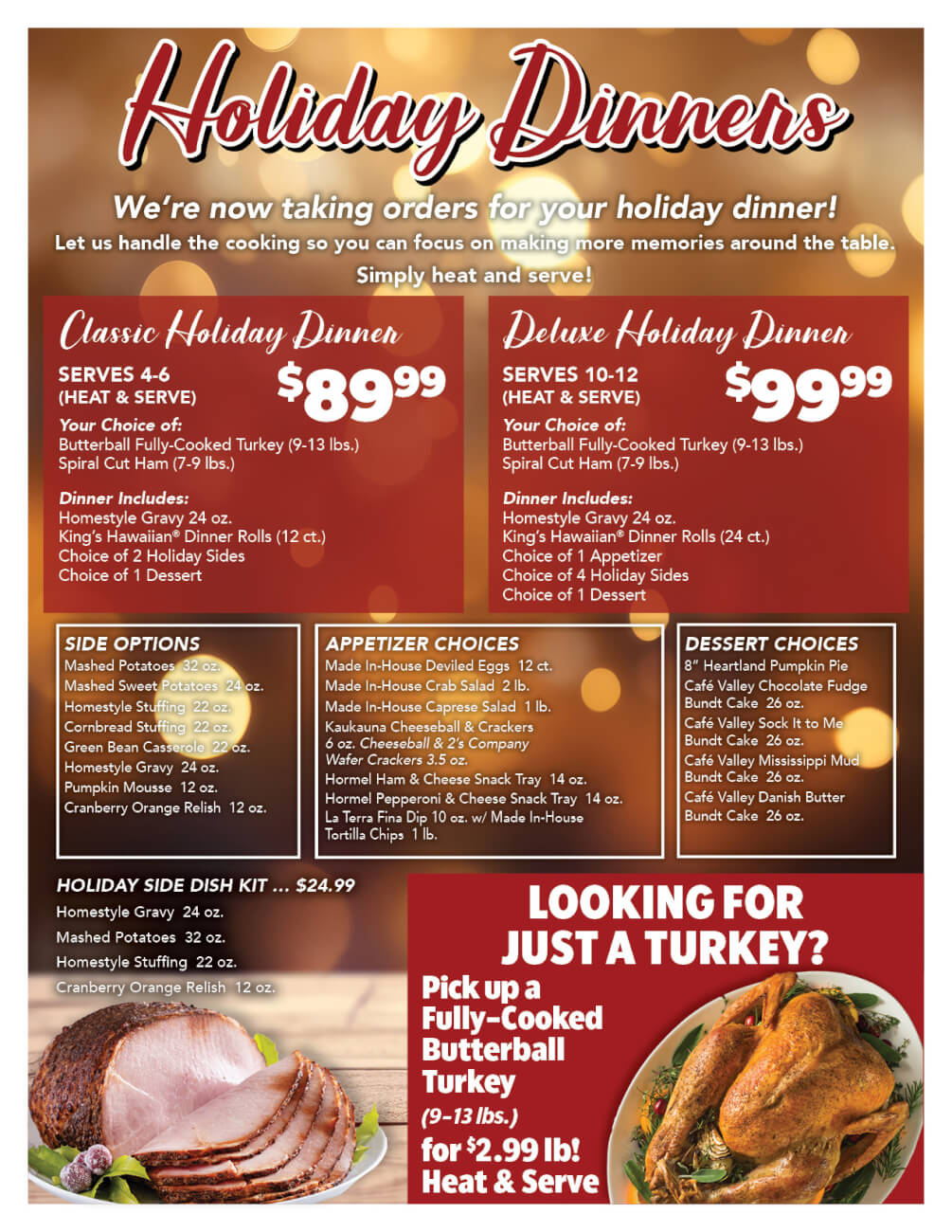 Choose from turkey or ham, your choice of sides and desserts. We have a wide variety of options to choose from. Pre-order yours today!