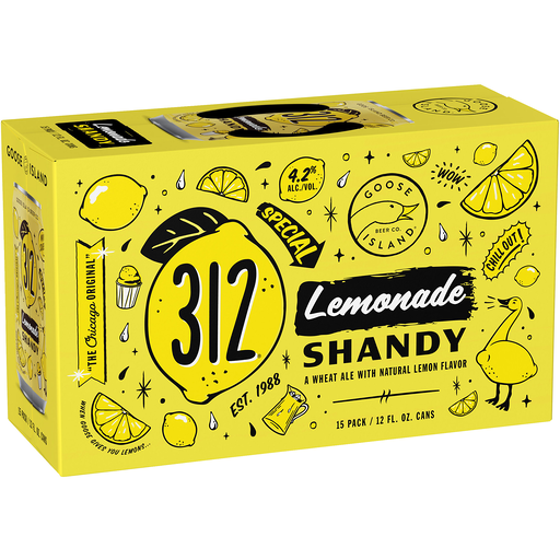 Goose Island Beer Co. 312 Lemonade Shandy Wheat Ale, 15 Pack 12 fl. oz. Cans, 4.2% ABV, Craft Beer. We’re just as tired of that same old shandy as everyone else–so we made our own combining two of our favorite things: 312 and Italian lemon ice. Expect a bright lemon flavor along with a slight sweetness, balanced by crisp lemon acidity.