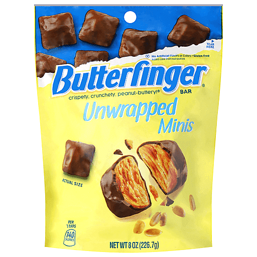 It's time to get your treat on with Butterfinger Unwrapped Minis. These bite-sized, peanut-buttery, chocolatey bites are mini in size but big on taste. Packed with the crispety, crunchety, peanut-buttery taste everyone knows and loves, these unwrapped mini peanut-buttery, chocolatey bars are easy to share, snack on and enjoy. The resealable bag lets you take these peanut-buttery, chocolatey bites anywhere and share with anyone. They're great for watching movies on the couch or taking them on the go. Butterfinger is made with no artificial flavors or colors and is gluten-free. Butterfinger Unwrapped Minis are the irresistible treat you love to share.