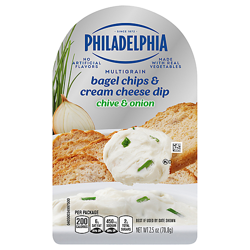 Philadelphia Bagel Chips & Chive & Onion Cream Dip is a great way to snack at home or on the go. Enjoy the perfect flavor combination of multigrain bagel chips with a savory chive and onion cream cheese dip. Just open the convenient single serving tray and you're ready to eat. Our delicious snack is made with real vegetables and no artificial flavors. Each 2.5-ounce bagel chip and Philadelphia cream cheese dip snack comes packaged in a sectioned tray so you can dip right out of the container. Keep Philadelphia Multigrain Bagel Chips & Cream Cheese refrigerated until ready to enjoy.