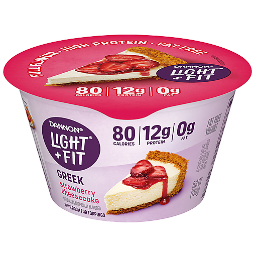 Looking for a delicious fat free yogurt with crave-able, sweet strawberry cheesecake flavor? Give your taste buds a reason to rejoice with Dannon Light + Fit Strawberry Cheesecake Greek Fat Free Yogurt. Every bite of this strawberry cheesecake flavored yogurt makes it easy to enjoy fat free snacks with this delicious light yogurt brand.* At Light + Fit, our goal is to help you do you by serving up some delightfully creamy Greek yogurt with sensational flavor. Our fat free Greek yogurt comes in single-serve cups, so you can live your life uninterrupted and enjoy them on the go. Protein is an essential nutrient we need in our diets, and with 80 calories and 12g of protein per 5.3 ounce serving, this Light + Fit yogurt is a deliciously satisfying and convenient option for adding complete protein every day. Pack a cup and enjoy it as a snack cup at work or as a late-night snack. Add a 5.3 oz yogurt cup to your breakfast parfaits and smoothies or use some in your favorite recipes as a flavorful substitute for baking ingredients. Plus, these strawberry cheesecake flavored 5.3 oz yogurt cups are perfect to enjoy as a protein-rich dessert or treat for any time. Add flavor to your day, every day, with a single serving snack cup of Dannon Light + Fit Strawberry Cheesecake Greek Fat Free Yogurt. *At least 50% less fat than average flavored Greek yogurt; Light & Fit: 80 calories, 0g fat; Average flavored Greek yogurt: 110 calories, 1g fat per 5.3 oz serving. **Consult your Healthcare Professional to learn how Light & Fit Greek yogurt can be included as part of a balanced diet.