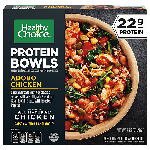 Boost your day with Healthy Choice Protein Bowls Adobo Chicken. Each Healthy Choice frozen entree is a delicious way to get a reliable source of fiber and protein to help you power through your day. This high-protein frozen meal features all-natural¹ chicken (raised without antibiotics) and mixed vegetables, including fire-roasted corn, tomatoes, and poblano peppers, served with a multigrain blend in a spicy guajillo chili sauce, perfect for a nourishing meal to fuel your body. A delicious way to keep you feeling satisfied, this power bowl frozen meal provides 32% of your daily protein with 22 grams per serving and 25% of your daily dietary fiber with 7 grams per serving and is perfect for a satisfying lunch or quick dinner. Simply microwave this frozen chicken bowl for 4 to 5 minutes and let stand for 1 minute. Keep in the freezer until ready to enjoy. ¹No artificial ingredients. Minimally processed.
