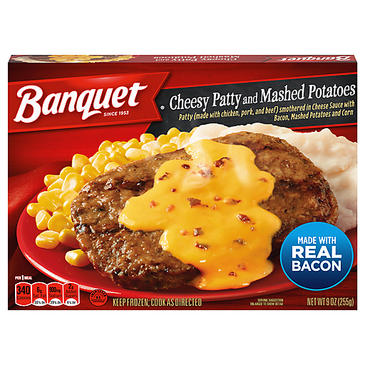 Banquet Cheesy Patty and Mashed Potatoes frozen meal brings delicious ready made meals to your table in minutes. This frozen dinner features a meat patty smothered in cheese sauce with bacon, mashed potatoes and corn for a delicious meal. Enjoy Banquet frozen meals any night of the week when you're in the mood for a cheesy meat patty. Preparation of this frozen food is easy. Simply follow the instructions on the package to prepare frozen lunches and dinners in the oven for fresh-cooked taste or in the microwave for quick, prepared meals. Store the 9 ounce meat and mashed potatoes meal in the freezer until you’re ready to enjoy frozen entrees. in the U.S.A. for over 60 years, Banquet has been making delicious food the whole family loves.