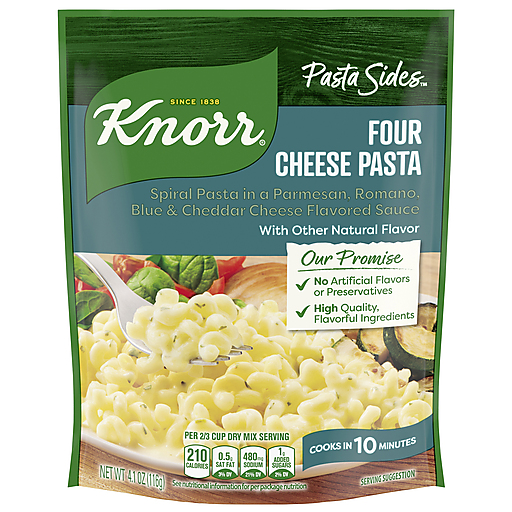 Treat your taste buds to Knorr Pasta Sides Four Cheese Pasta. Our pasta side Four Cheese Pasta expertly combines tender fusilli with a Parmesan, Romano, Blue, and Cheddar cheese-flavored sauce. In addition to tasting delicious, our pasta side dish is easy to prepare. Knorr Four Cheese Pasta Sides cooks in minutes on the stovetop, or in the microwave, and it's perfect as the base for a delicious main dish or as a standalone side dish. Make Knorr Pasta Sides the foundation of a crowd-pleasing dinner or an easy meal. Knorr Pasta Sides have no artificial flavors or preservatives, and no added MSG, except those naturally occurring glutamates. Use these easy pasta side dishes to create a mouth-watering main dish. Simply prepare Knorr Pasta Sides and add your favorite meat and vegetables to make a dinner your family is sure to love. You can find great recipes from Knorr, like our chef-inspired Fusilli with Chicken & Spinach. Discover more quick and delicious dinner ideas at Knorr.com. Hundreds of recipes are available to help you find dinner inspiration. We at Knorr believe that good food matters, and everyday meals can be just as magical as special occasions. Our products owe their taste and flavors to the culinary skills and passion of our chefs, and we source high-quality ingredients to create delicious side dishes, bouillons, sauces, gravies, soups, and seasonings enjoyed by families everywhere.