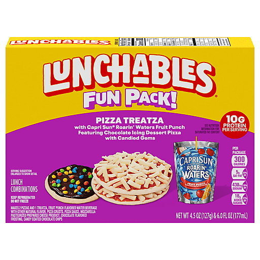 Have fun with lunch! Lunchables Pizza Treatza Fun Pack! lets kids create their very own personal pizzas. Each 4.5 ounce box makes two tasty pizzas and one treatza, and contains pizza crusts, pizza sauce, mozzarella pasteurized prepared cheese product, chocolate flavored frosting and candy coated chocolate chips. Kids can eat their custom cheese pizzas right out of the refrigerator or heat and eat — either way, they taste great! For a tasty treat, kids can make their own delicious treatza with rich icing and candied gems. Sip on a 6 fl oz pouch of Capri Sun Roarin' Waters Fruit Punch Flavored Water Beverage with other natural flavor. Packed with protein and fun in every bite, each serving contains 10 grams of protein. With no prep needed, our Lunchables kit is perfect as part of school lunches, weekend bites or any time hunger strikes. The real win is that kids get to make it and eat it their way! Keep Lunchables refrigerated until you're ready to enjoy.