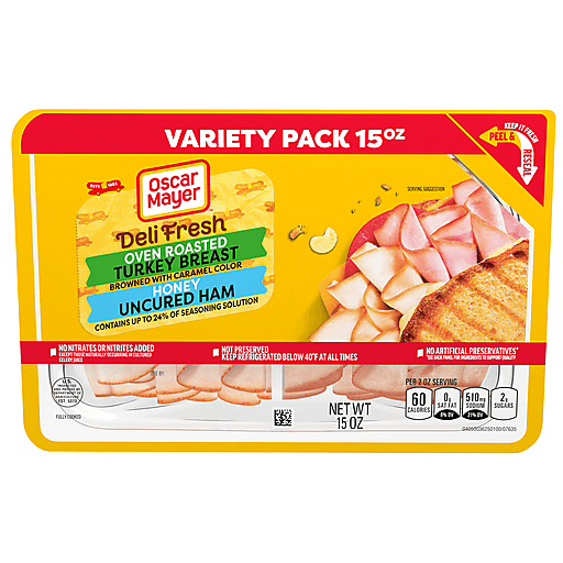Make a delicious deli sandwich at home with Oscar Mayer Deli Fresh Oven Roasted Turkey Breast browned with caramel color & Honey Uncured Ham contains up to 24% of a seasoning solution browned with caramel color no added nitrates or nitrites except for those naturally occurring in cultured celery juice Sliced Lunch Meat Family Size Variety Pack. Our quality oven roasted turkey breast and honey uncured ham lunch meat are made with no artificial preservatives, see back panel for ingredients used to support quality, and no added nitrates or nitrites. Fully cooked and ready to eat together or separately, our oven roasted turkey and honey uncured ham slices deliver a delicious flavor combination that's perfect for a sandwich, salad, or cheese and crackers. Keep our 15-ounce family sized variety package of deli turkey and deli ham refrigerated to maintain freshness. If you enjoy our deli ham and turkey, be sure to try the other varieties of Oscar Mayer lunch meat.