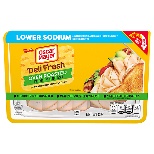 Make a delicious deli sandwich at home with Oscar Mayer Deli Fresh Oven Roasted Turkey Breast Sliced Lunch Meat with 34% Lower Sodium. Our lower sodium turkey breast has the same oven roasted taste you know and love, but with 34% less sodium than USDA data for smoked turkey breast lemon pepper flavor. Made with no artificial preservatives, see back panel for ingredients used to support quality, and no added nitrates or nitrites, you can enjoy the fresh taste you want with nothing you don't. Fully cooked and ready to eat, our turkey slices have a deliciously rich, classic turkey flavor that's perfect for a sandwich, salad, or cheese and crackers. Keep our 8-ounce package of deli turkey refrigerated to maintain freshness. If you enjoy our oven roasted deli turkey with 34% lower sodium, be sure to try the other varieties of Oscar Mayer turkey lunch meat.