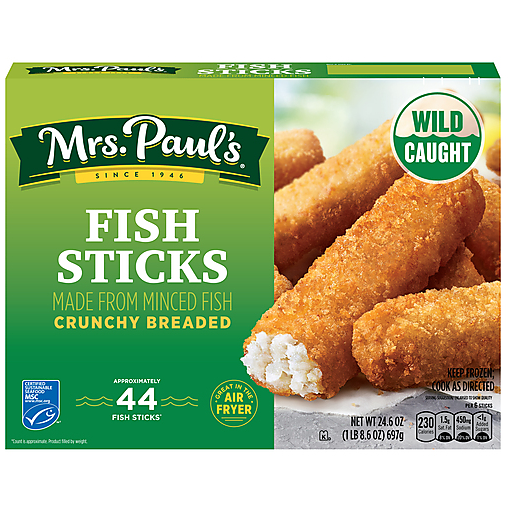 When you want delicious, crispy fish sticks, reach for Mrs. Paul's Crunchy Breaded Fish Sticks. This mouthwatering, wild-caught pollock is surrounded by a golden breading that is the perfect combination of flavor and crispiness. Whether you are adding them to your favorite fish taco recipe, dipping them in tartar sauce or simply eating them all by themselves, you will love these tasty fish sticks. Easily prepared in the air fryer or the oven, they're a natural source of Omega-3s*, are a good source of protein, with 10 grams per serving, and are certified sustainable seafood** so you'll feel good about what you're feeding your family.
