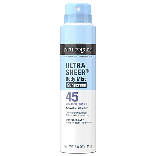 Neutrogena Ultra Sheer Body Mist Sunscreen Spray with Broad Spectrum SPF 45 provides powerful sun protection that you will love to wear to help prevent sunburn. Formula is Oxybenzone-free, Hawaii Act 104 compliant. With Helioplex technology, this non-greasy body sunscreen provides superior UVA/UVB protection in an easy-to-use spray format. The sun screen formula also absorbs quickly with a sheer, ultralight finish and a weightless, clean feel. This SPF 45 spray sunscreen is non-comedogenic and oil-free, so it won't leave a heavy residue or clog pores. When used as directed with other sun protection measures, may decrease the risk of skin cancer caused by the sun. Convenient and easy-to-use sunscreen spray can provide no-mess application for face and body. Dermatologist recommended sun care brand, Neutrogena sunscreen is water-resistant for up to 80 minutes. Apply prior to sun exposure to keep skin protected during outdoor activities like gardening, biking, hiking, boating or walking.