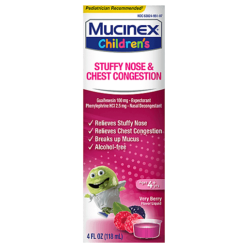 Mucinex Children’s Stuffy Nose & Chest Congestion is a Multi-Symptom Relief medicine for your child’s chest and nasal congestion. Mucinex Children’s Stuffy Nose & Chest Congestion thins and loosens mucus, relieves chest congestion and stuffy nose. Mucinex Children’s is the #1 Pediatrician Recommended Brand*. It is available in Very Berry flavor. It is to be used for Children 4 years and over. This product contains 4 FL OZ and a dosing cup.