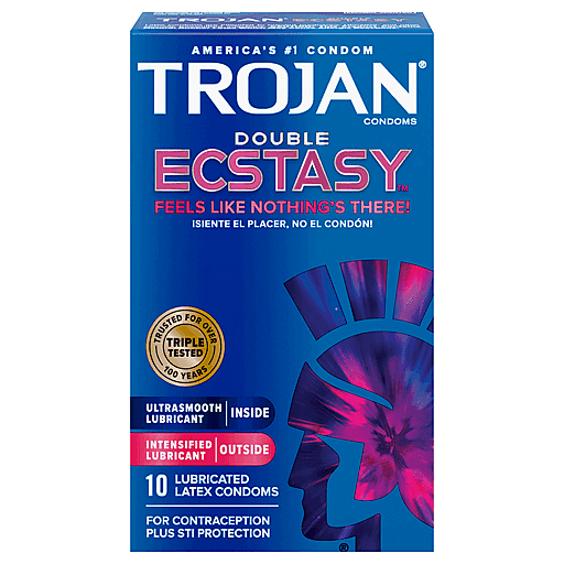 Trojan Double Ecstasy Condoms feature a unique design that lets you feel the pleasure, not the condom. Feels like nothing's there! Deep ribs at the base and end increase stimulation, while the comfort shape allows freedom of movement for an enhanced sexual experience. The UltraSmooth lubricant inside for him and the intensified lubricant outside for her help maximize the pleasure for both partners. They’re made from a premium quality latex and are electronically tested to help ensure reliability. These condoms reduce the risk of unintended pregnancy and sexually transmitted infections (STIs) while you play. Includes one 10 count box of Trojan Double Ecstasy Condoms. Trojan Brand condoms are America's #1 condom, trusted for over 100 years. The Trojan Brand promotes a safe, healthy and fun sex life. From condoms to vibrators to lubricants, Trojan Brand is dedicated to delivering innovative, high-quality products that offer pleasure and protection.