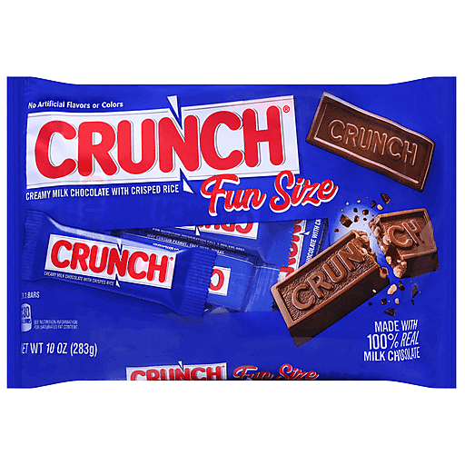 It's time to get your sweet treat on with CRUNCH Fun Size candy bars in a shareable pack. These perfectly fun sized, crispy chocolate bars are small in size but big on taste. Packed with creamy 100% milk chocolate and crisped rice, these individually wrapped candy treats are easy to snack on and enjoy. The shareable pack lets you take these irresistible chocolate bars anywhere and share with anyone. They're great for the home or office candy bowl, school lunch boxes, parties, get-togethers, dessert or a movie night sweet treat. CRUNCH is made with no artificial flavors or colors. CRUNCH Fun Size candy bars are the treat everyone knows and loves.